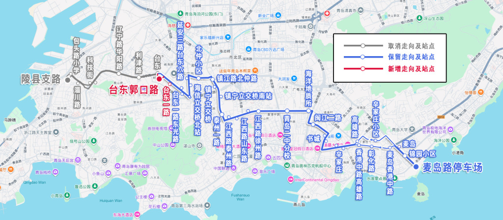 主站麦岛路停车场,副站由陵县支路调整为台东郭口路,调整后为:麦岛路停车场—台东郭口路。