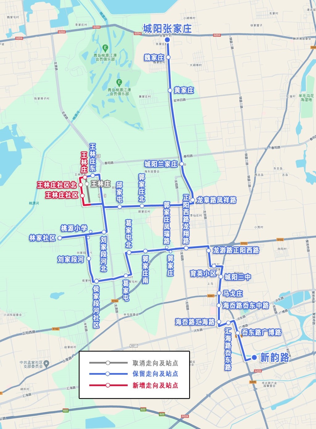 上行:自“城阳张家庄”返程站,沿原路线至“王林庄东”车站,沿王林庄村级路、龙源路、林家村村级路至“桃源小学”车站,恢复原路线至“新韵路”车站止。