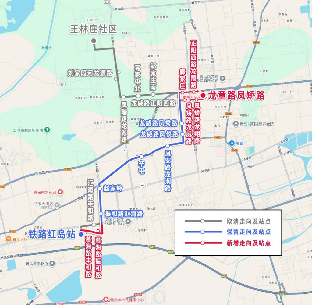 主站铁路红岛站,副站由王林庄社区调整为龙章路凤矫路,调整后为:铁路红岛站—龙章路凤矫路。