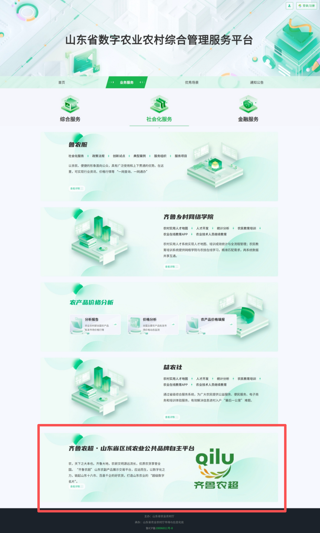 其二,在“齐鲁农云”官网的“业务服务”栏目下,选择“社会化服务”即可找到“齐鲁农超”板块,点击后可跳转至“齐鲁农超”平台,浏览并购买全省十六市近6000家优质农企的上万款名优农产品。