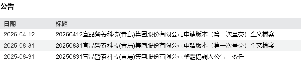 继2025年8月31日首次递表失效后,宜品营养科技(青岛)集团股份有限公司(下称 “宜品营养”)4月12日再度递表港交所,拟在主板上市,联席保荐人仍为海通国际和中信建投国际。