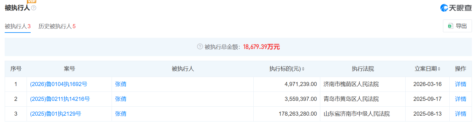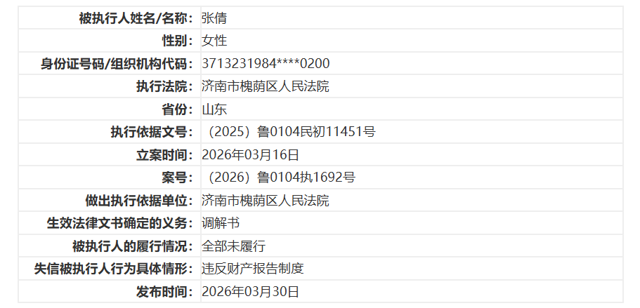 3月30日,张倩被济南市槐荫区人民法院列入失信被执行人名单,失信被执行人行为具体情形为“违反财产报告制度”,被执行人的履行情况为“全部未履行”,立案时间为2026年3月16日。