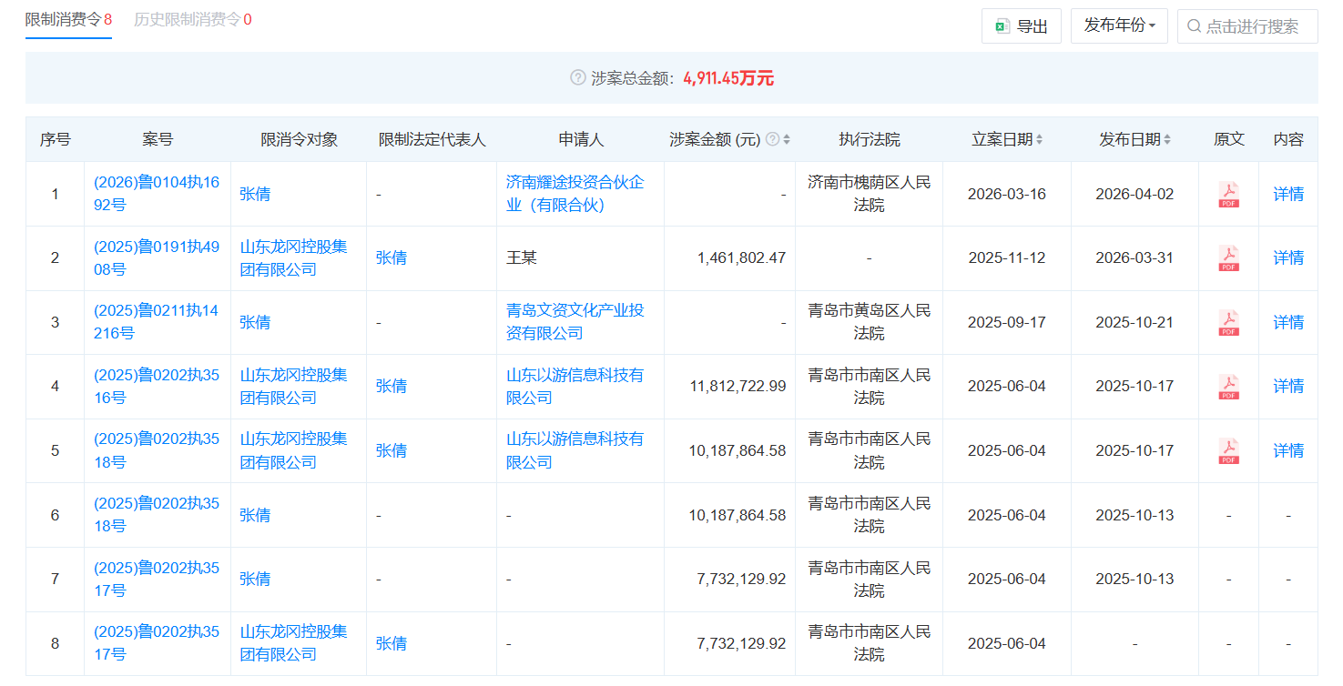 截至目前,张倩已8次被法院限制高消费,涉案总金额4911.45万元。其中,涉及2起民间借贷纠纷案件,因张倩和山东龙冈控股集团有限公司 未按执行通知书指定的期间履行生效法律文书确定的给付义务,分别被青岛市市南区人民法院和济南市槐荫区人民法院采取限制消费措施。