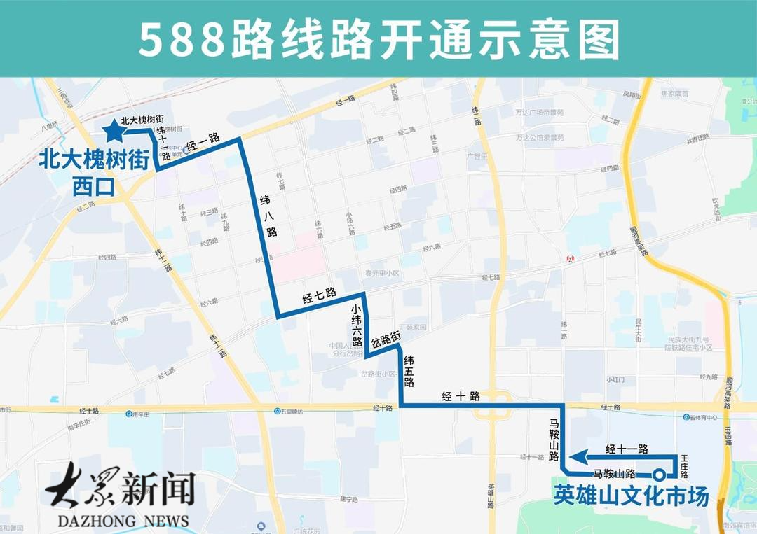 为持续做好线网优化工作,加强与经十路地铁4号线的接驳,增加纬八路、小纬六路等道路公交覆盖。自4月15日起,济南公交开通试运行588路。