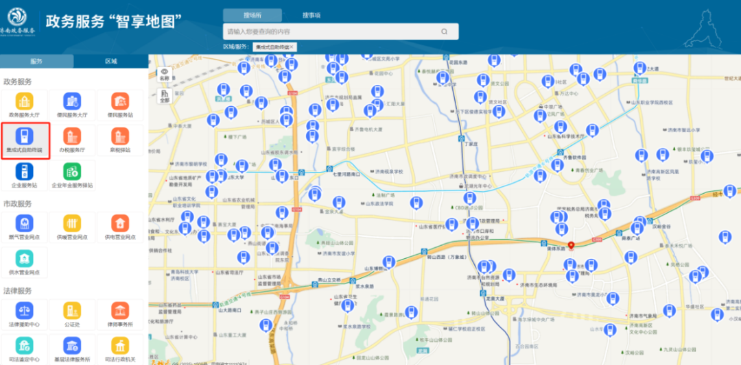 目前,济南市已部署集成式政务服务自助终端590余台,覆盖市、区县政务服务中心及街道(镇)便民服务中心,并在部分社区(村)便民服务站、产业园区、银行网点等场所同步布设,通过政务服务“智享地图”就可以查询到附近的自助终端设备。