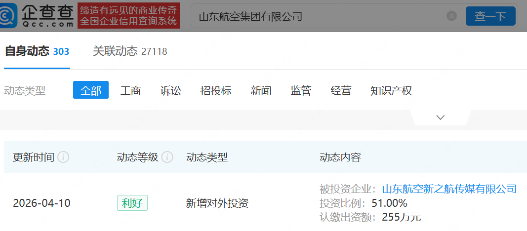 企查查显示,近日,山东航空集团有限公司(下称“山航集团”)新增对外投资,被投资企业为山东航空新之航传媒有限公司(下称“山航传媒”),认缴出资额为255万元,投资比例为51%。