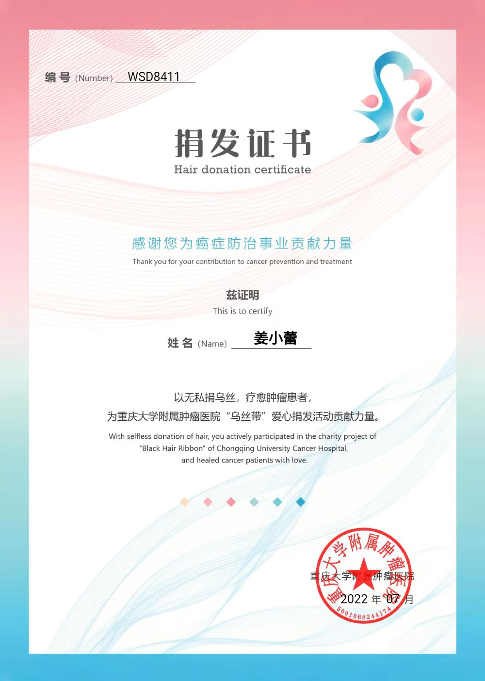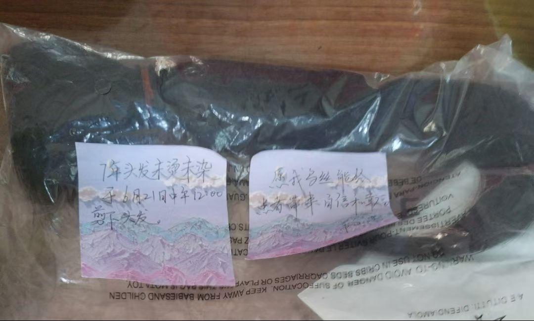 2022年6月,头发长至腰际,测量达48厘米。理发店老板惋惜表示这头优质长发能卖上千元,劝她三思,姜小蕾却坚定拒绝:“不卖,要给它第二次生命。”剪发后,她附上两张亲笔纸条,写下“七年未烫未染”“愿我乌丝带来自信幸福”的字句,通过线上渠道寄往重庆。收到捐发电子证书时,她激动地在朋友圈分享了这份喜悦。
