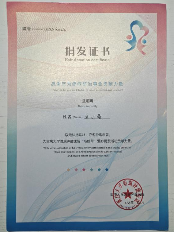 2015年,一档节目中白血病患儿化疗后脱发、渴望头发的场景,触动了她。“孩子们掉光头发后特别期盼能重拾笑容,我的头发从未烫染,或许能帮上忙。”带着这份初心,她四处搜寻捐发渠道,最终锁定重庆大学附属肿瘤医院“乌丝带行动”,加入捐发交流群,摸清了“长度超35厘米、无烫染、无明显分叉”的要求。