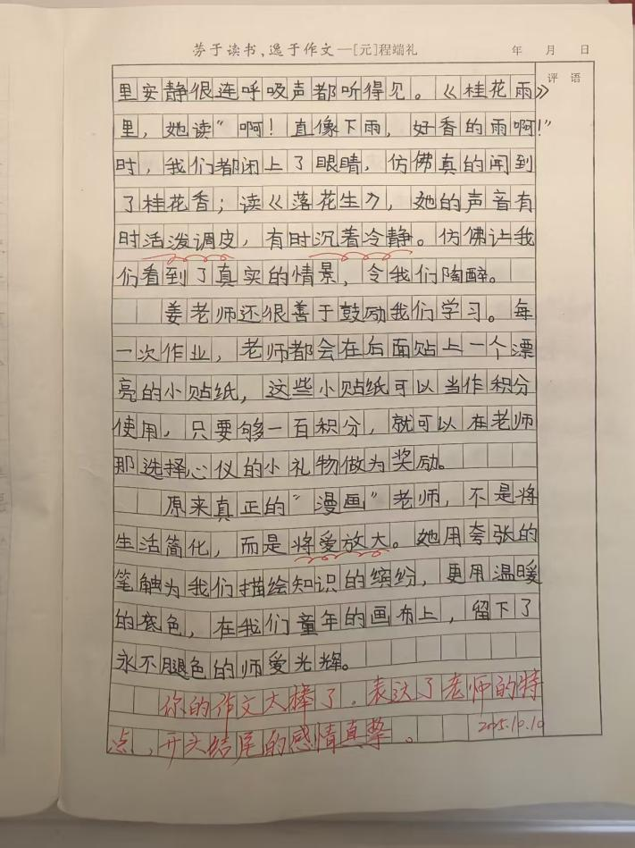 剪去长发后,姜小蕾从“发簪配新中式”换成休闲装短发,引来学生们围着追问:“老师,你怎么舍得剪长发?”“新发型像朵拉,真可爱!”“像刘胡兰一样正义凛然!”面对好奇,姜小蕾细细讲述了捐发故事。五年级学生张一言深受触动,写下作文记录这份善意;不少家长也特意称赞她“用实际行动给孩子上了最生动的一课”。