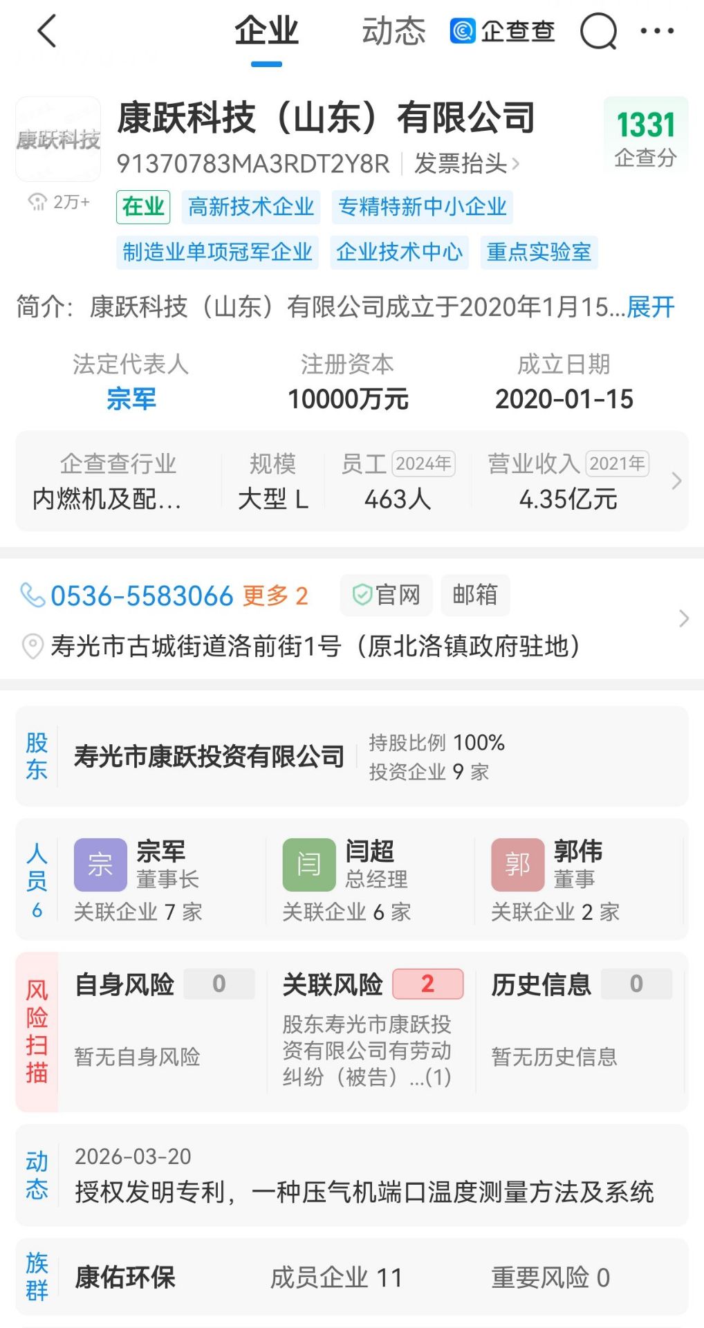 企查查显示,现存实体康跃科技 (山东) 有限公司董事长为宗军,寿光市康跃投资有限公司100%持股。公司位于山东潍坊寿光,继续专注于涡轮增压器研发生产,目前运营正常 。