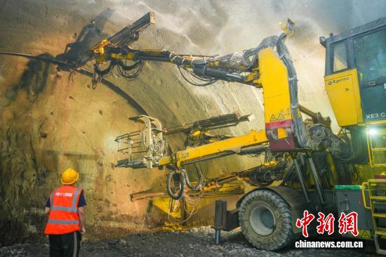 3月30日,建设者在运用三臂凿岩台车进行施工。