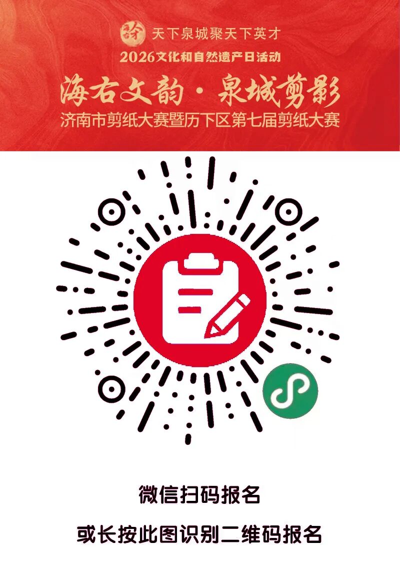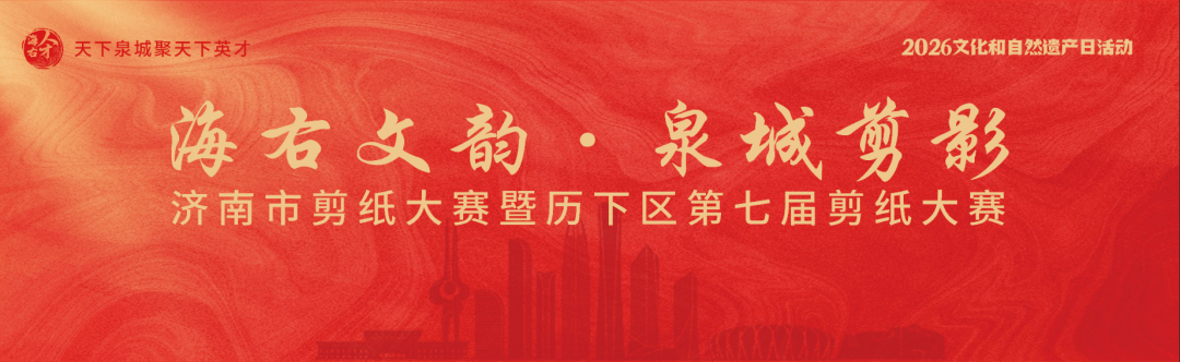 海右此亭古,济南名士多。为迎接2026年“文化和自然遗产日”,现正式启动“海右文韵·泉城剪影”济南市剪纸大赛暨历下区第七届剪纸大赛(简称“大赛”)作品征集。本次剪纸大赛以刀剪为笔,以红纸为卷,旨在共同刻画名士风骨,剪出英才风采,生动展现济南“海右人才”的深厚底蕴与“天下泉城”的时代气象,推动优秀传统文化创造性转化、创新性发展。现将有关事宜通知如下: