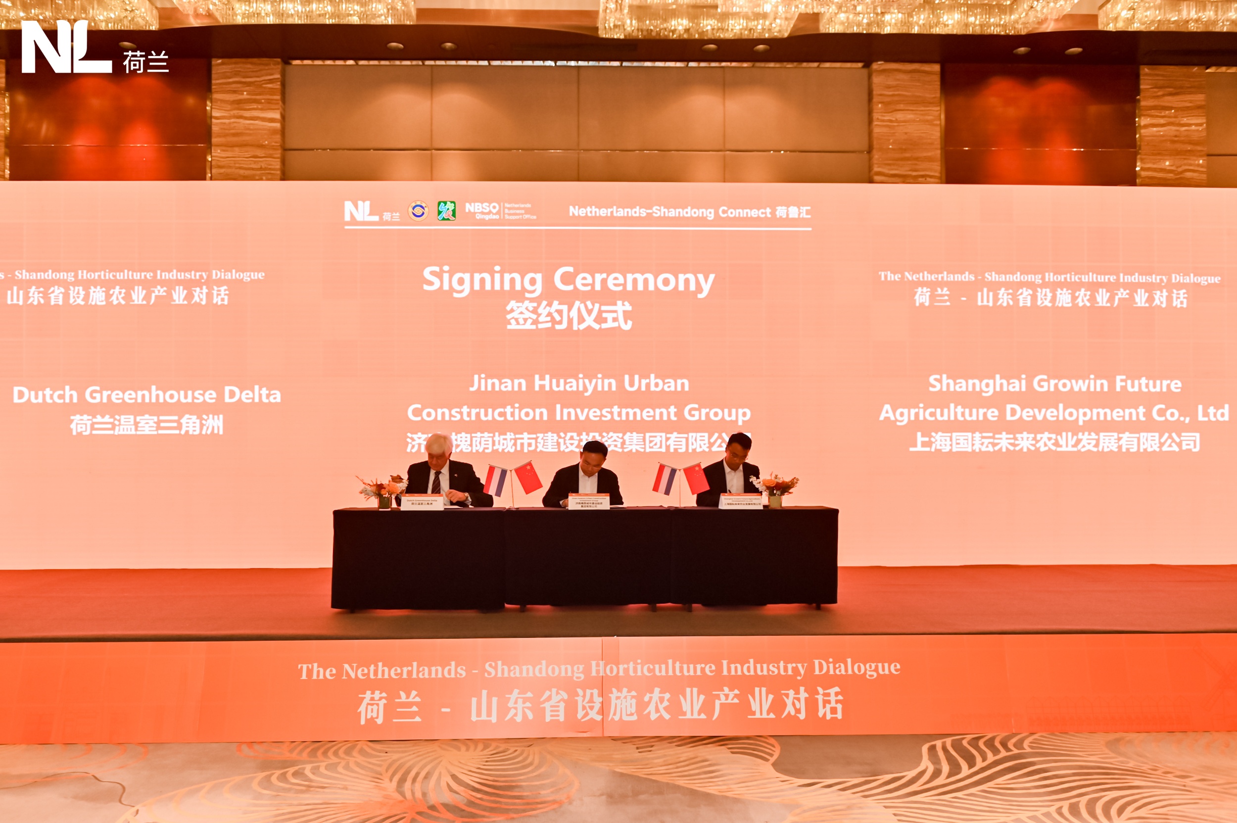 活动期间,槐荫城建投资集团、国耘未来农业科技与荷兰温室三角洲现场签署了三方合作协议,标志着鲁荷设施农业合作迈出从意向到项目落地的重要一步。随后,山东省副省长陈平,荷兰驻华使馆临时代办、公使霍齐德(Tsjeard Hoekstra)共同按下启动屏,正式发布“荷鲁汇”产业对话品牌并启动“荷兰—山东产业合作周”。