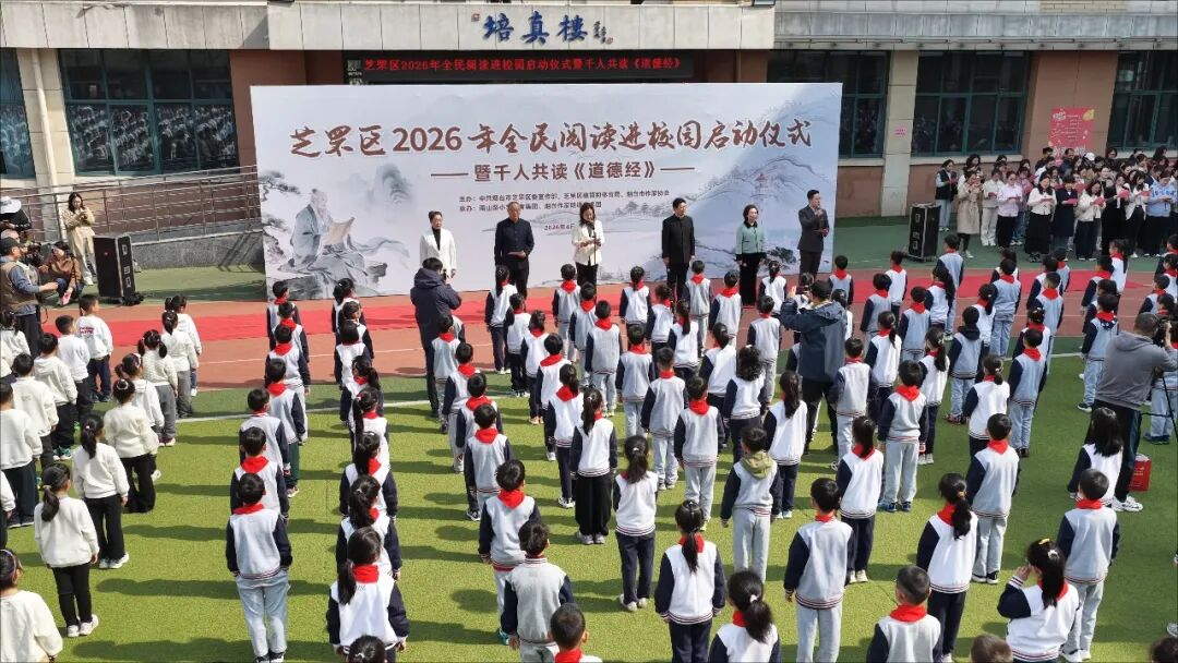 4月13日上午,芝罘区委宣传部联合区教体局,携手烟台市作协、烟台作家朗诵艺术团,在南山路小学举办芝罘区2026年全民阅读进校园启动仪式暨千人共读《道德经》活动。南山路小学师生、家长、志愿者共计1800余人参加活动。