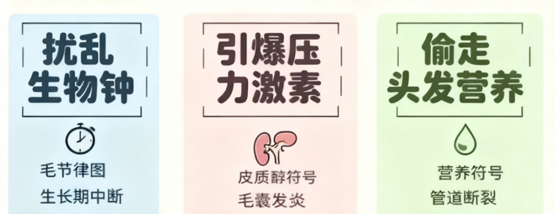 济南市中心医院皮肤科副主任王丽华表示,熬夜后的脱发,并非错觉,其背后有着清晰的科学逻辑,它主要从三个方面对头发发起“攻击”。