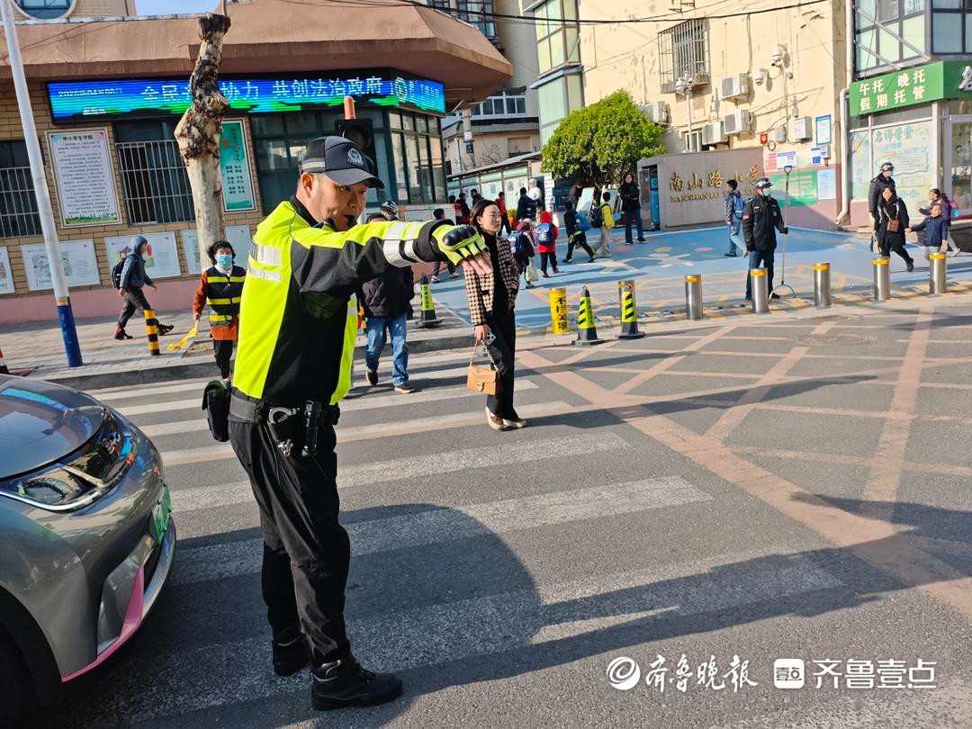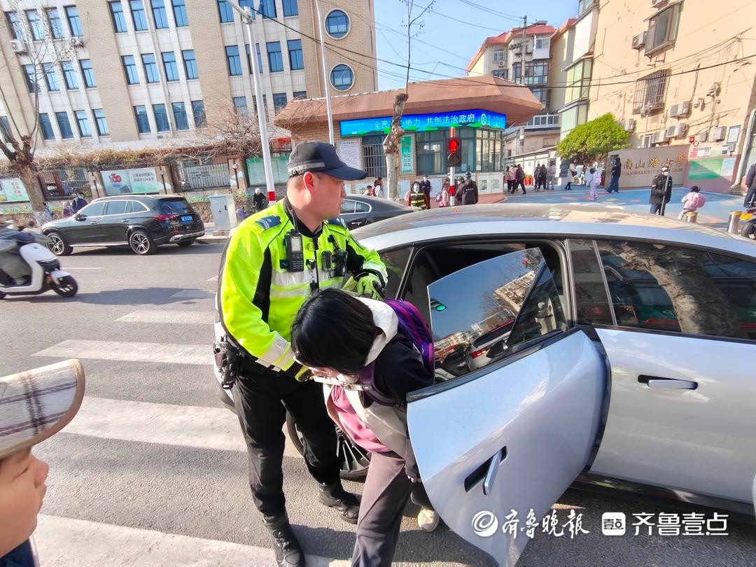 在烟台市芝罘区南山路小学门口,送学生的车刚停稳,就有一位辅警拉开车门、接下孩子,为他们背好书包再护送进校门,而家长的车在校门口即停即走。这样的“默契”源于习惯,更源于信任。