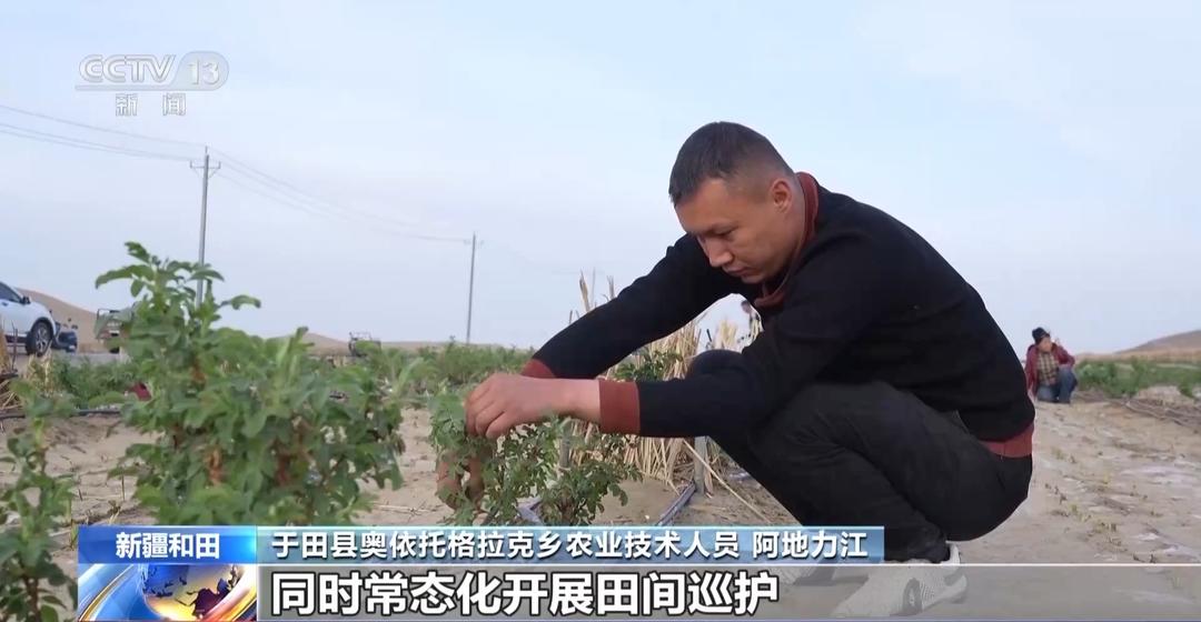 于田县奥依托格拉克乡农业技术人员 阿地力江:重点指导农户把控浇水频次、优化施肥配方,同时常态化开展田间巡护,及时解决种苗病虫害防治难题。