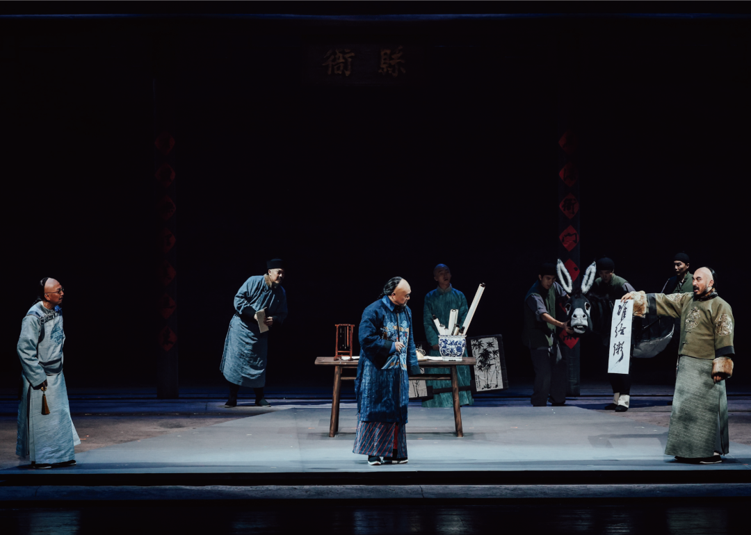 该剧以乾隆年间潍县连年灾荒为背景,聚焦郑板桥力排众议私开官仓赈灾、智斗乡绅纾解民困等故事片段,既有“燃点”,也有“笑点”,更有“泪点”。北京人民艺术剧院一级演员何冰以精湛演技将郑板桥的文人风骨与清廉担当融为一体,让廉洁文化在艺术演绎中直抵人心。舞台之上,青砖黛瓦、镂空窗棂搭配水墨写意布景,将中式美学与郑板桥“删繁就简三秋树”的艺术理念深度融合。与板桥形影不离的毛驴“懂事”,以诙谐灵动的拟人化表演,既增添舞台趣味,又巧妙映衬郑板桥抱朴守正、耿介为民的精神内核。