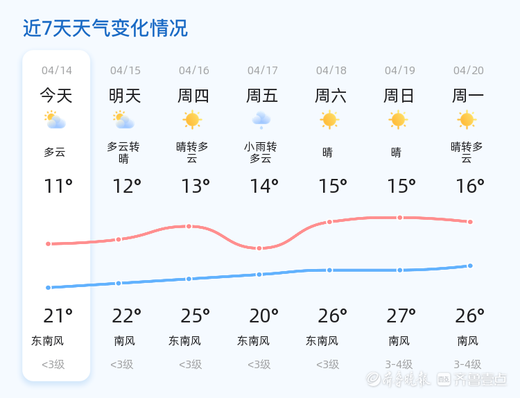 今天是4月14日,星期二,农历二月廿七。菏泽市今日天气多云,气温介于11℃至21℃之间,目前实时温度13.8℃,西风2级,空气湿度89%,PM2.5指数为38,空气质量良好。各区县天气情况基本一致,均为多云天气,风力较小,体感较为舒适。