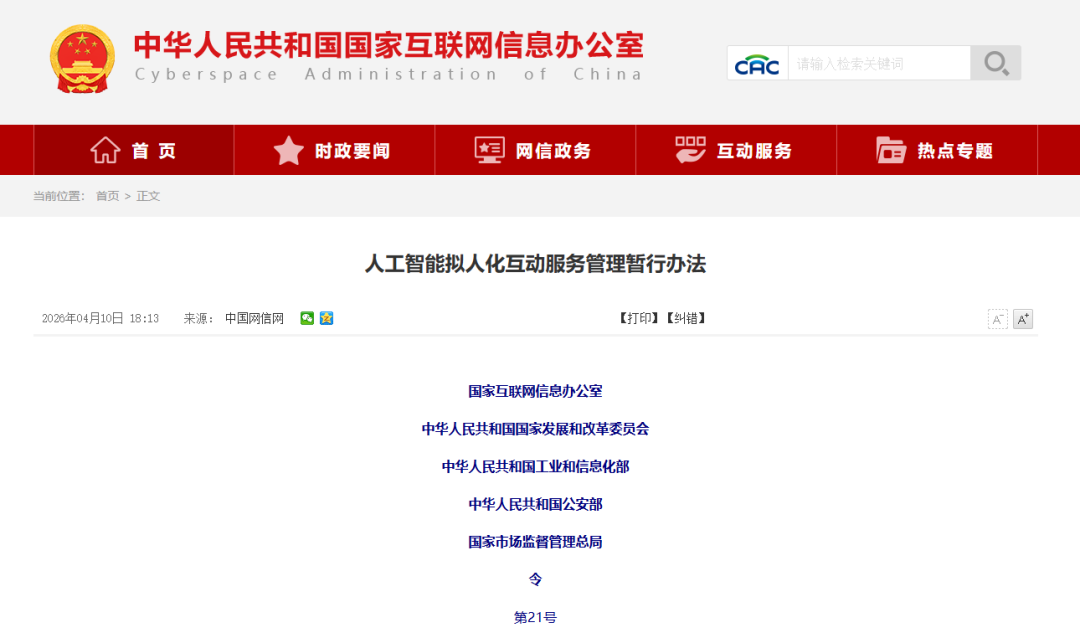 据媒体报道,今年7月15日,《人工智能拟人化互动服务管理暂行办法》将正式施行(以下简称“《办法》”)。《办法》明确提出,严禁向未成年人提供虚拟亲属、虚拟伴侣等虚拟亲密关系服务;向不满十四周岁的未成年人提供其他拟人化互动服务,需要取得监护人同意;同时,还要求平台建立未成年人模式,支持监护人进行使用行为管理、限制充值消费等。