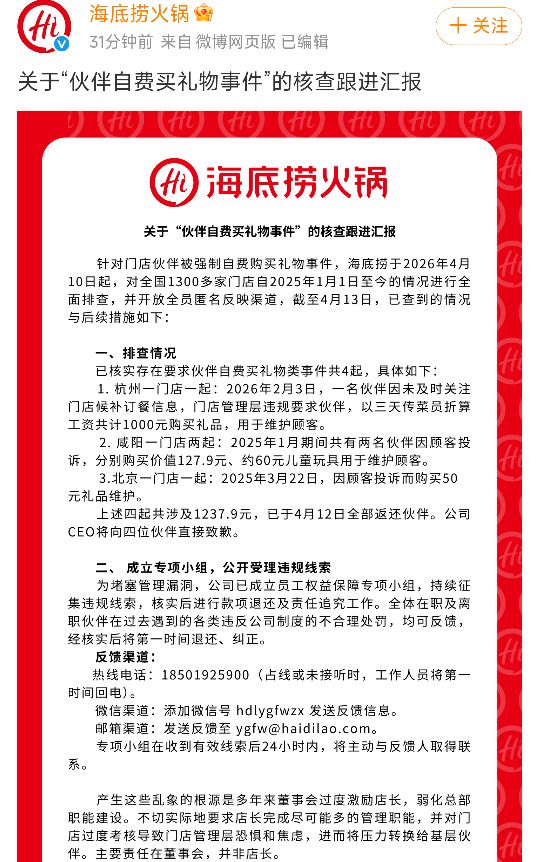 针对这一情况,海底捞在声明中表示,公司已于4月10日起对全国1300多家门店自2025年1月1日以来的情况进行全面排查,并开放全员匿名反映渠道。截至4月13日,共核实到4起要求伙伴自费购买礼物的事件,涉及总金额1237.9元,相关款项已于4月12日全部返还给涉事员工,公司CEO将向这四位伙伴直接致歉。