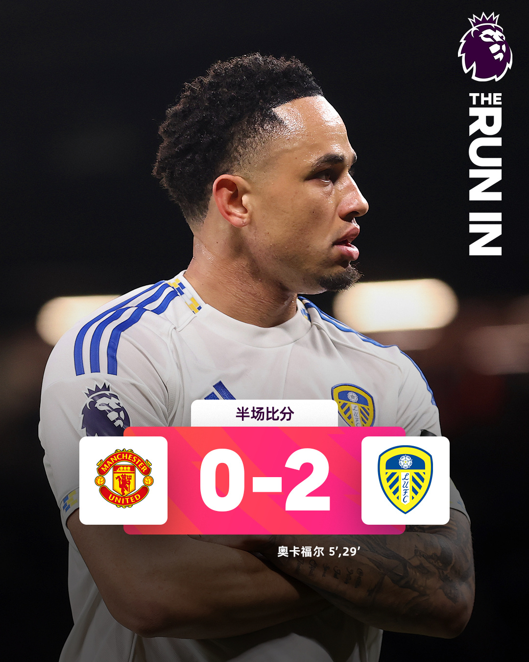 第30分钟,利兹联球员奥卡福尔外围凌空抽射破门,梅开二度,曼联0-2落后。
