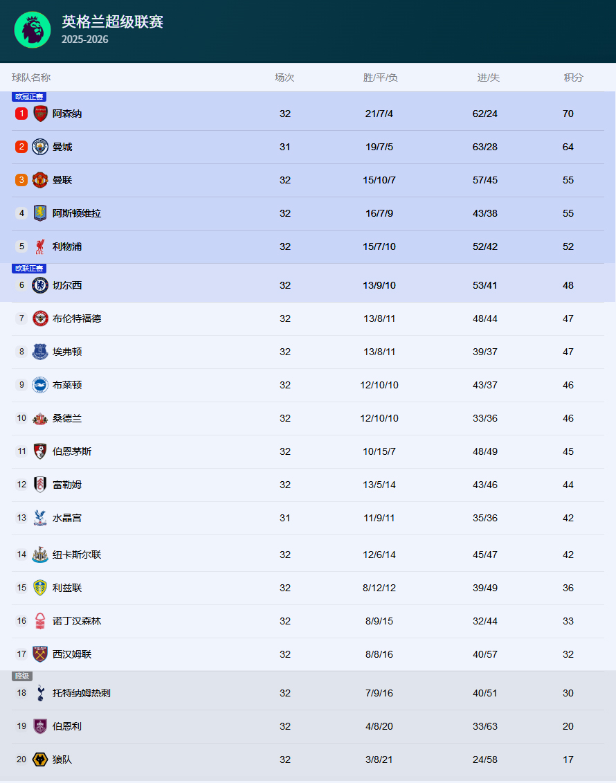 赛前曼联积55分位列英超积分榜第3,与阿斯顿维拉同分且手握欧冠资格主动权。曼联主场状态优异,自2025年11月以来联赛主场不败,球队在卡里克执教下已斩获五连胜。曼联31轮攻入56球,射门次数联赛第一,已连续26场联赛破门。经过24天休赛期,球员的体能也比较充沛。