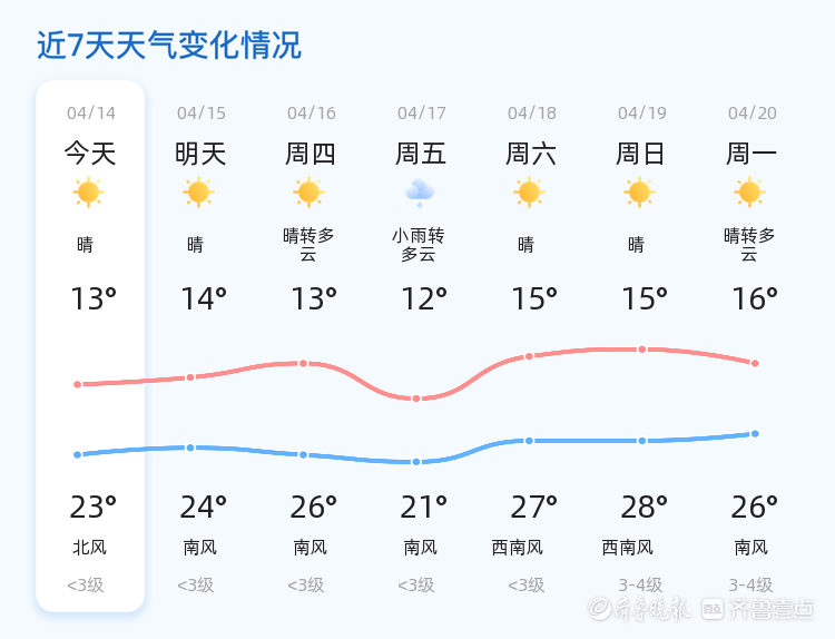 未来三天,泰安市天气以晴到多云为主,气温逐渐升高,最高气温将达到26℃,最低气温维持在13℃左右。周四(4月16日)天气晴转多云,周五(4月17日)有小雨天气过程,市民需注意携带雨具。周末(4月18日至19日)天气转晴,气温回升,但风力有所增强,风速为3-4级,市民出行时需注意防范。