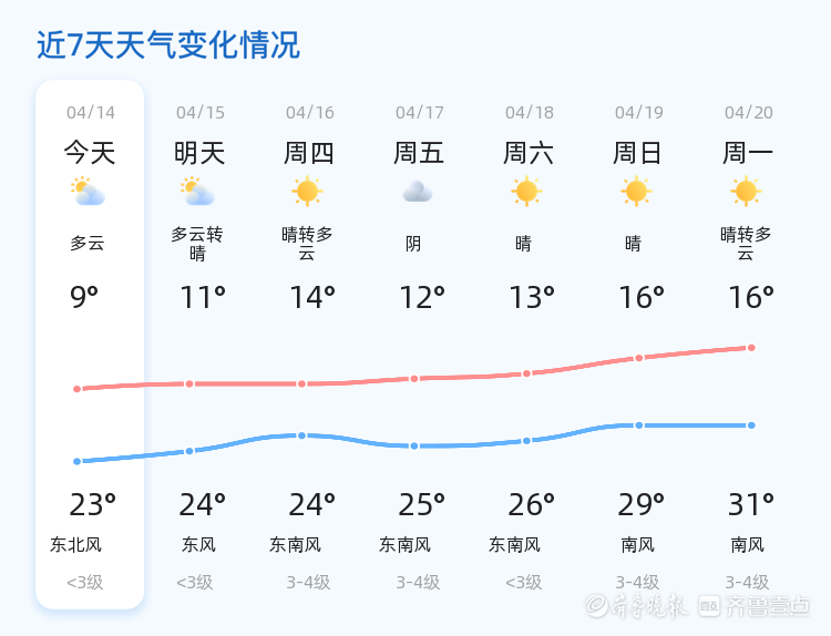 今天是4月14日,星期二,农历二月廿七。东营市今日天气多云,气温在9℃至23℃之间。目前温度为10.2℃,湿度为100%,空气质量良好,PM2.5指数为55。风力较小,为西北风1级。全市各区天气情况一致,均为多云。市民出行请注意适时增减衣物,随身携带雨具以备不时之需。明日天气较今日略有变化,预计为多云转晴,气温在11℃至24℃之间。风向转为东风,风力仍为小于3级。市民可以适当减少衣物,但早晚温差较大,仍需注意保暖。未来三天,东营市天气趋势呈现多变特点。周四(4月16日)天气由晴转多云,气温在14℃至24℃之间,风力增强至3-4级;周五(4月17日)天气阴,气温在12℃至25℃之间,风力仍为3-4级;周六(4月18日)天气晴朗,气温在13℃至26℃之间,风力小于3级。市民需根据天气变化适时调整着装,特别是周四和周五风力较强,建议减少高空作业和避免在广告牌等危险区域停留。温馨提示