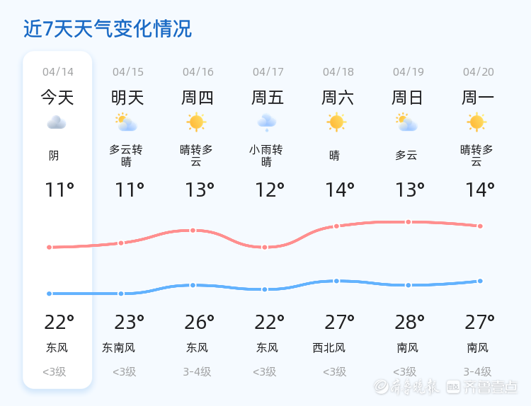 今日是4月14日,星期二,农历二月廿七。枣庄市天气为阴转多云,气温在11℃至22℃之间,北风1级,空气湿度为73%,PM2.5指数为63。各区县天气情况总体稳定,以阴或多云为主,风力较小,适合市民户外活动。