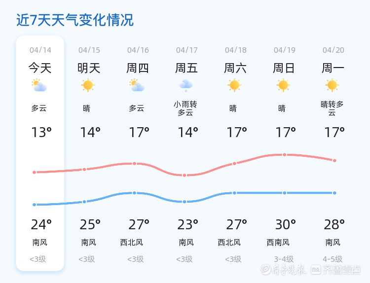 今天是4月14日,星期二,农历二月廿七。济南市天气多云转晴,气温在13℃至24℃之间,东南风1级,空气湿度为79%,PM2.5指数为70,空气质量良好。各区天气情况基本一致,市民出行较为适宜。