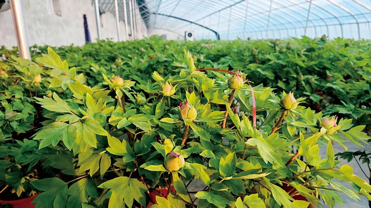 优良品种为产业发展打下基础,催花技术则让菏泽牡丹打破了季节限制。过去“花开不过二十日”,如今菏泽通过“催花先养根”等核心技术,配合智能温室与冷链物流,实现了牡丹按需定时开放。2025年春节期间,菏泽催花牡丹销量约60万盆,每盆售价100元至300多元,仅春节档销售额就超1亿元。位于牡丹区黄堽镇的绿美牡丹产业园,拥有近60座标准化催花大棚,年出货量20万盆,被当地人称为“牡丹工厂”。随着催花、控花技术逐步普及,如今在菏泽,一年四季都能见到盛开的牡丹。