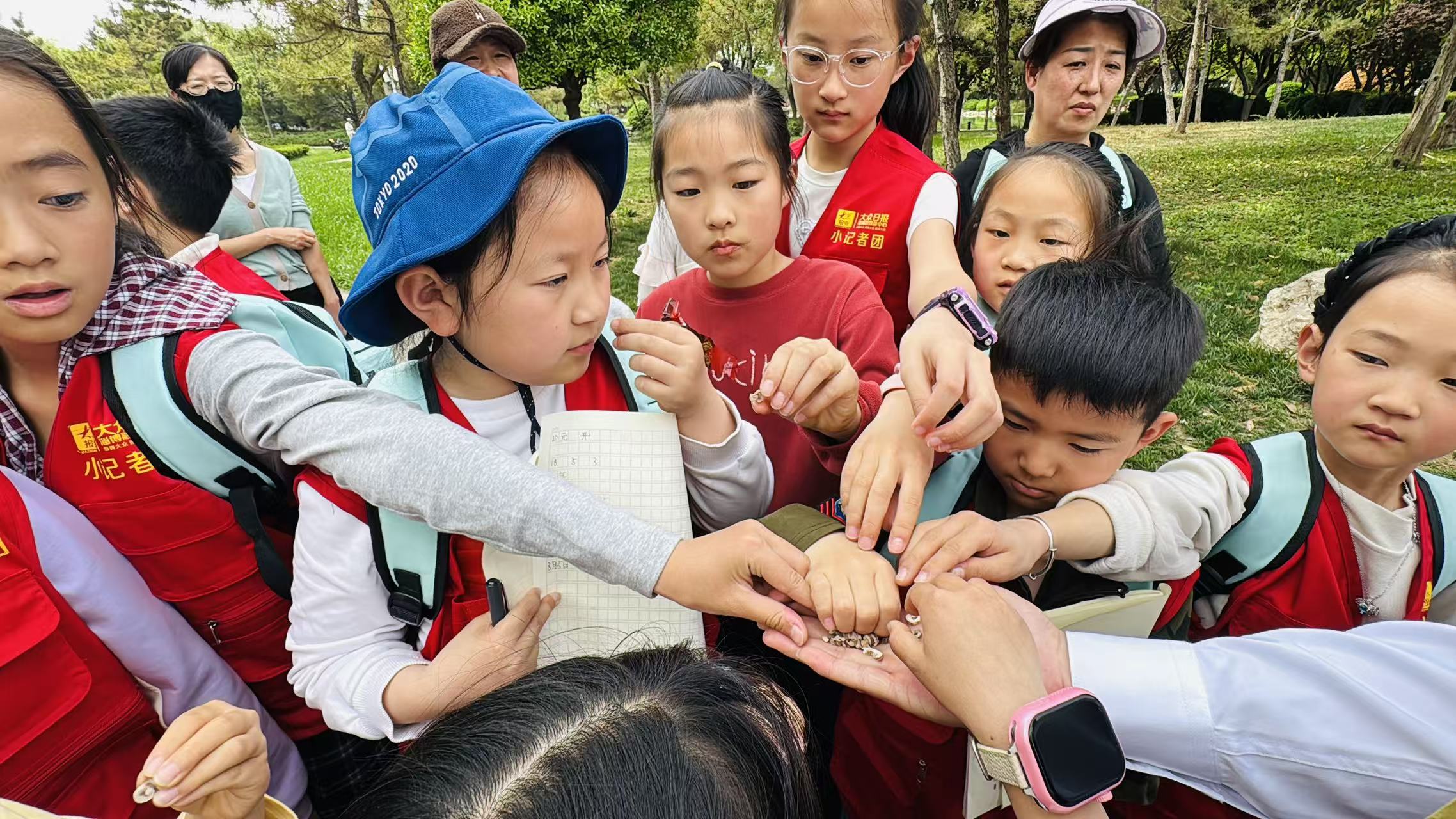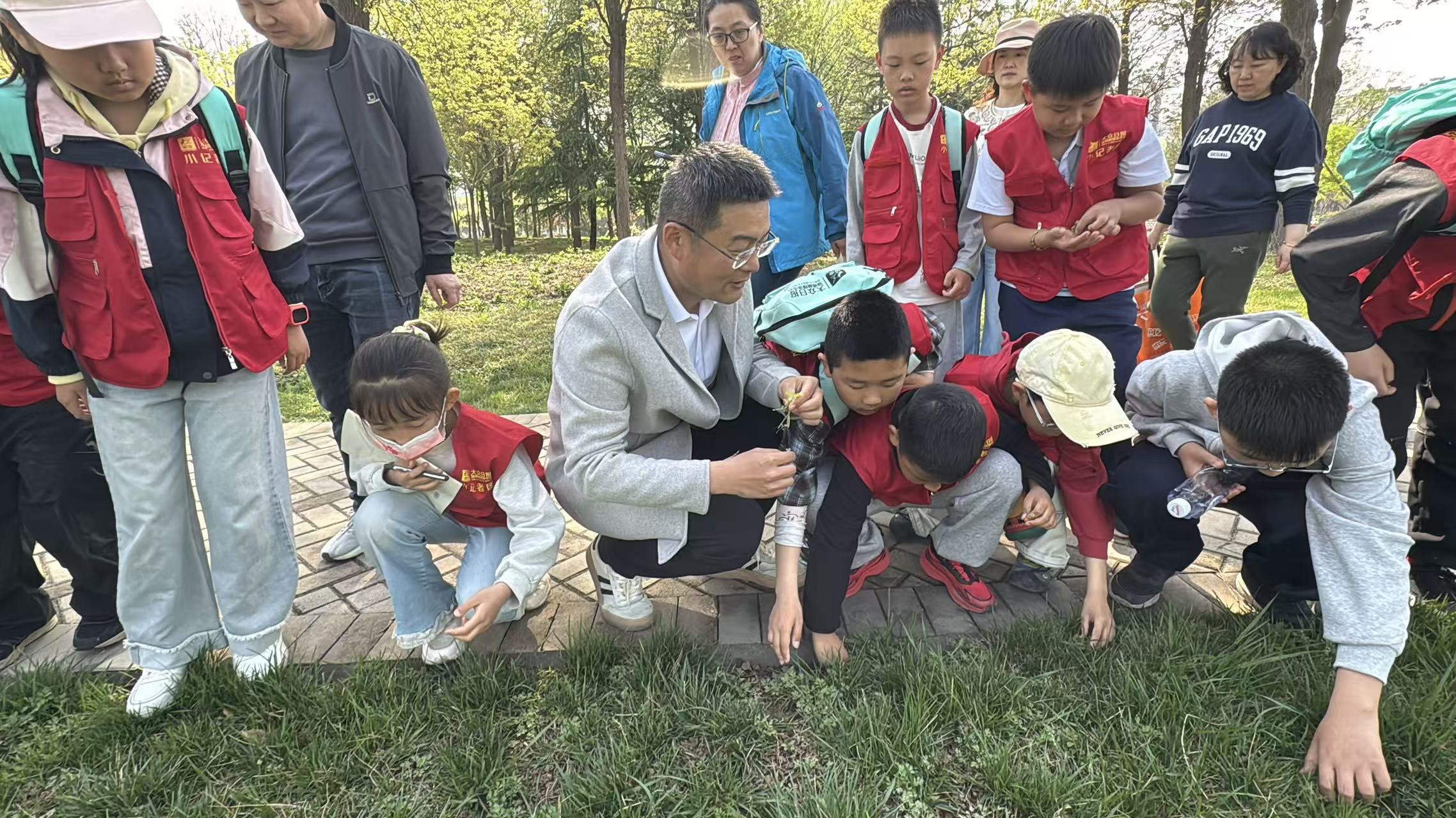 理论知识刚“热身”,激动人心的“本草寻宝”环节便拉开了帷幕。在医师和带队老师的引领下,小记者们化身目光如炬的“小药童”,穿梭于火炬公园的林间草丛。“快看!我找到了车前草,它的叶子像小勺子!”“这个开白色小花的是荠菜,原来它也是一味中药!”惊喜的欢呼声此起彼伏。在医师的耐心指点下,牡丹、苦菜、青青菜、辛夷、连翘等平日里被忽视的花草树木“现出原形”,成为孩子们眼中珍贵的草药宝藏。大家一边仔细观察叶片的纹理、花朵的形态,一边认真聆听每种植物的功效与习性,真正做到了“在玩中学,在学中悟”。