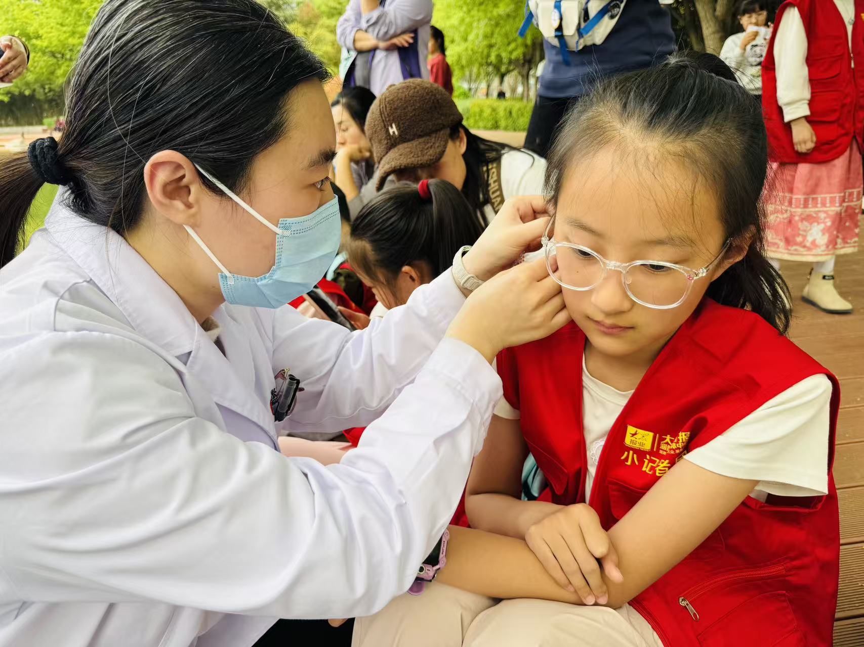 活动的压轴环节,是一场令小记者们啧啧称奇的“耳穴压豆”初体验。“耳朵上竟然藏着全身的健康密码?”带着满腹疑惑,孩子们轮流坐到医师面前。医师根据青少年预防近视、健脾开胃等成长需求,精准辨识耳穴,将一粒粒小小的“王不留行籽”贴敷在孩子们的耳廓上。当感受到那微微的酸胀感时,小记者们既紧张又兴奋:“太神奇了!不用打针吃药也能调理身体!”这堂生动的健康自护课,让孩子们直观领略了中医“治未病”的独特魅力,也让他们懂得:最好的医生,其实就藏在我们自己的身体里。