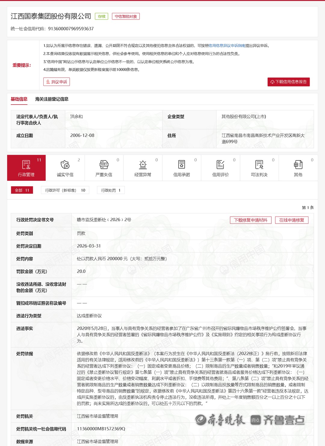 近日,信用中国公布了对江西国泰集团股份有限公司(国泰集团 603977.SH)的行政处罚决定。