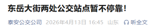 4月13日,泰安公交公司发布消息:即日起,公交车在东岳大街两处公交站点“岱庙、泰山区人民医院”“泰山区区委区政府”暂不停靠,详情如下: