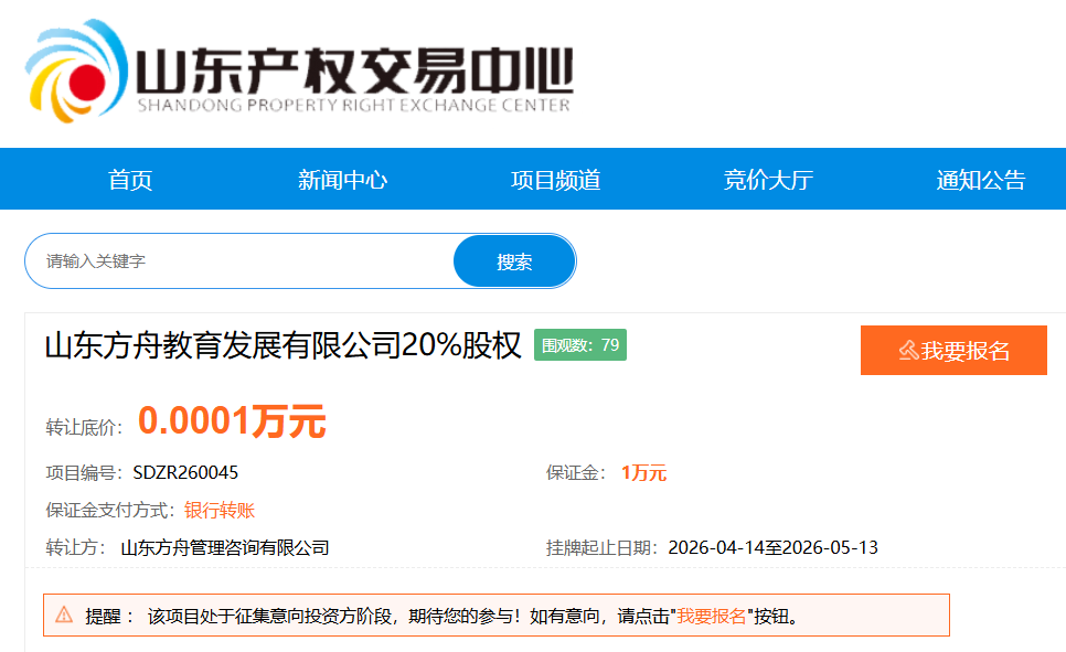 4月14日,山东产权交易中心股权转让公告显示,潍坊市人才发展集团旗下的山东方舟管理咨询有限公司拟转让其持有的山东方舟教育发展有限公司(下称“方舟教育”)20%股权,挂牌价格为1元人民币,挂牌期限自2026年4月14日至5月13日。