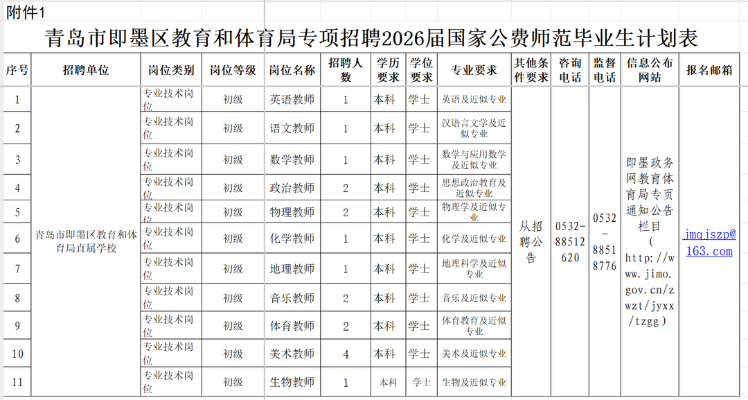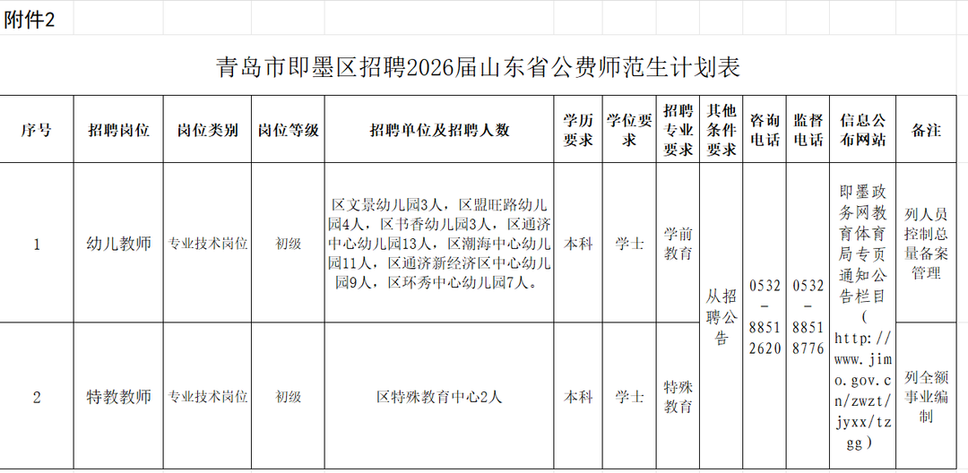 1.计划招聘教育部直属师范大学2026届青岛市即墨区生源公费师范毕业生18名,具体岗位详见附件1;