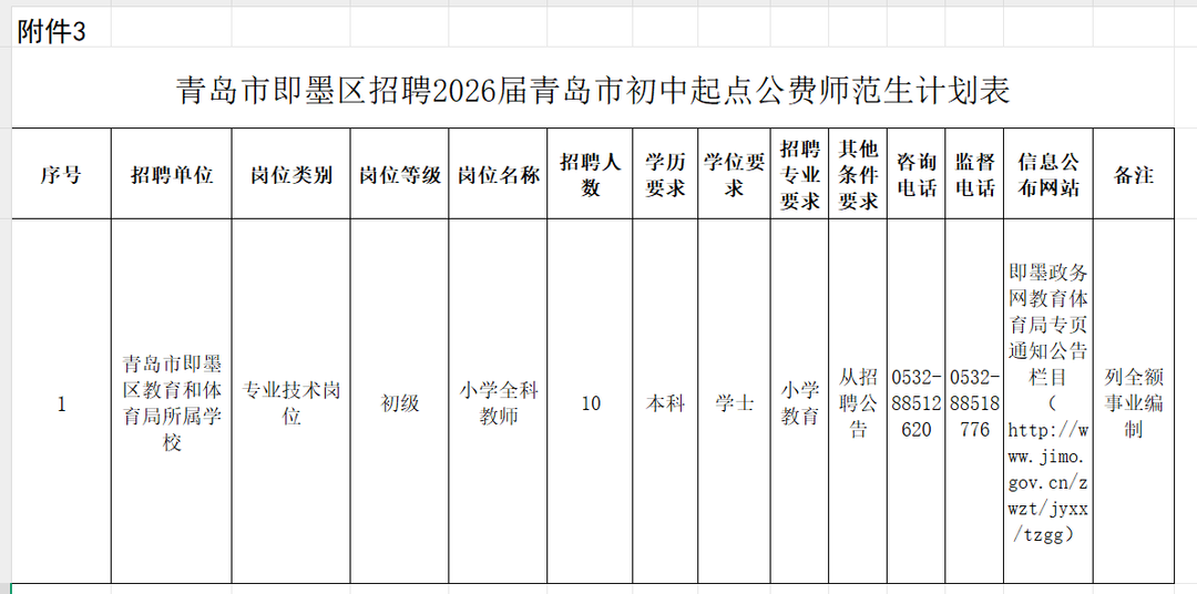 3.计划招聘面向即墨区就业的2026届青岛市初中起点公费师范生10名,具体岗位详见附件3。