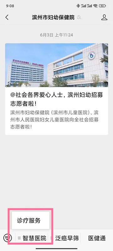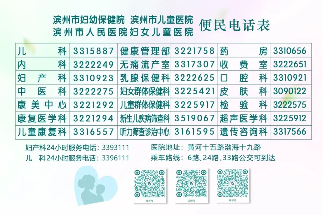 咨询电话:0543-3212847"预约挂号方式"滨州市妇幼保健院服务号预约第一步:识别图中二维码“滨州市妇幼保健院”第二步:点击“智慧医院”“诊疗服务”第三步:点击“门诊预约”第四步:选择相应科室备注:预约前需绑定电子健康卡电话、来院路线请往下看
