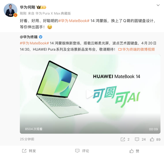 4月14日,华为MateBook 14鸿蒙版电脑官宣,将于4月20日14:30在HUAWEI Pura系列及全场景新品发布会上正式发布。