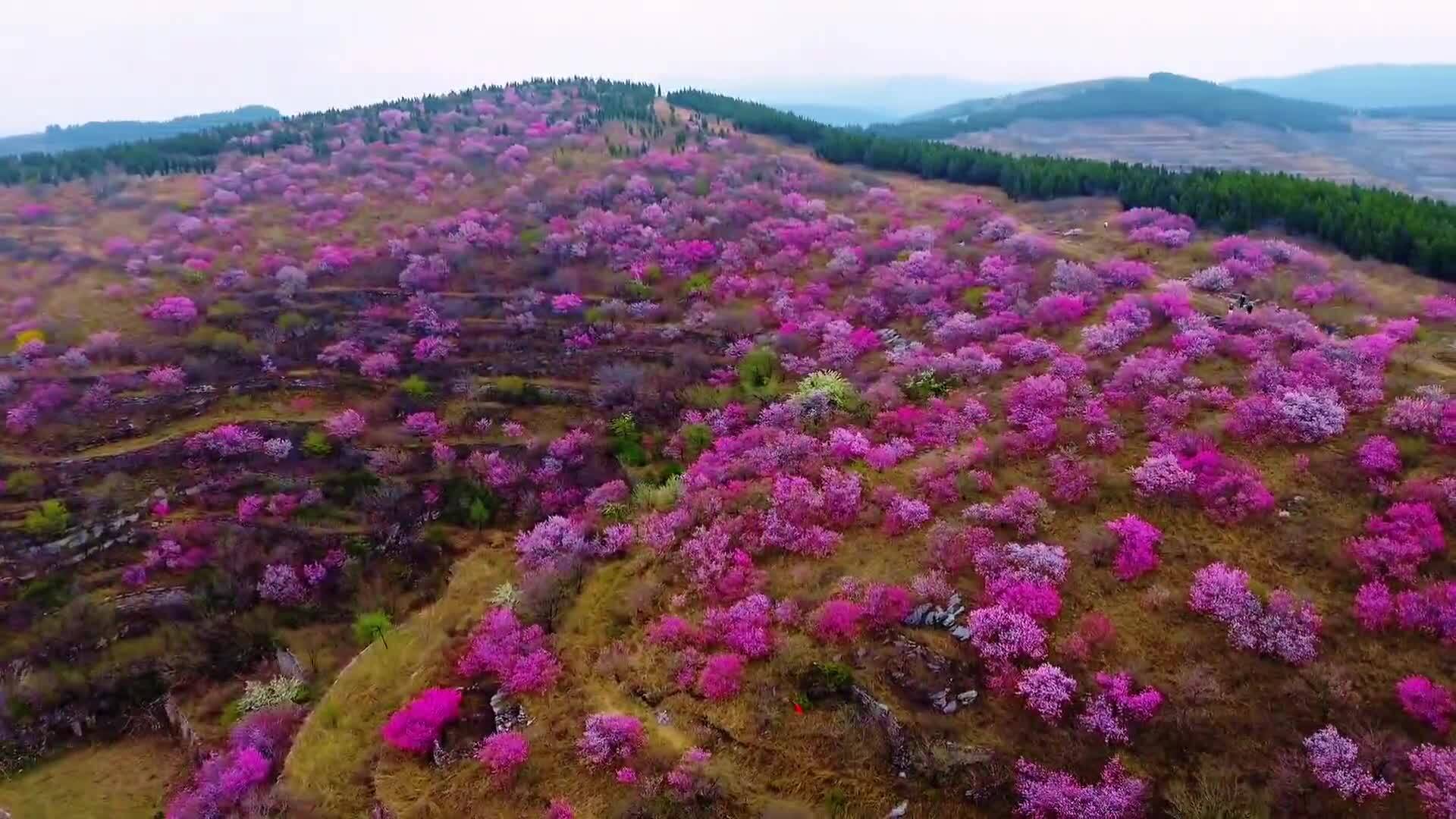 桃之夭夭醉春风。时下,淄博市博山区石马镇上焦村桃花盛开,红粉色桃花撞色山脊另一侧的绿色松树,形成别样春日景象。
