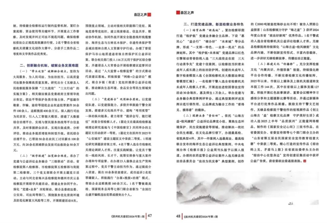 近日,无棣县检察院撰写的《以党建红引领检察蓝 促深度融合提质效》一文,刊发于中共滨州市委市直机关工委主办的《滨州机关建设》2026年第1期 “县区之声” 栏目,充分展现了党建与检察业务深度融合的生动实践与显著成效。
