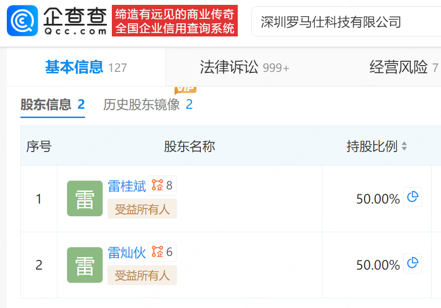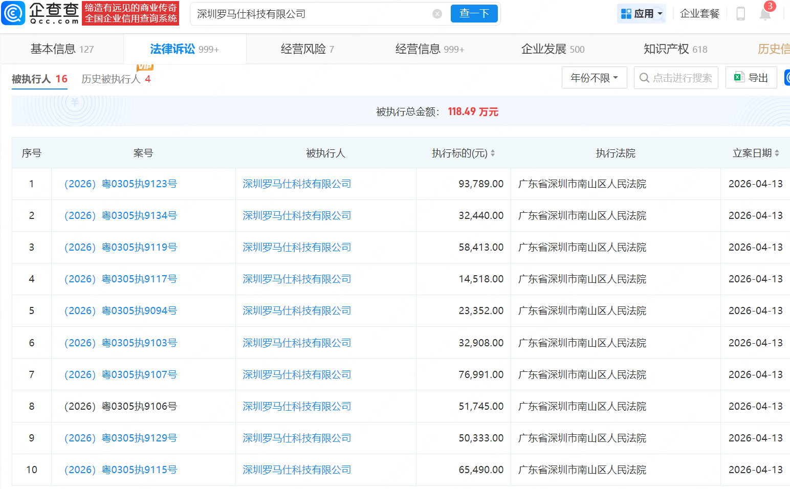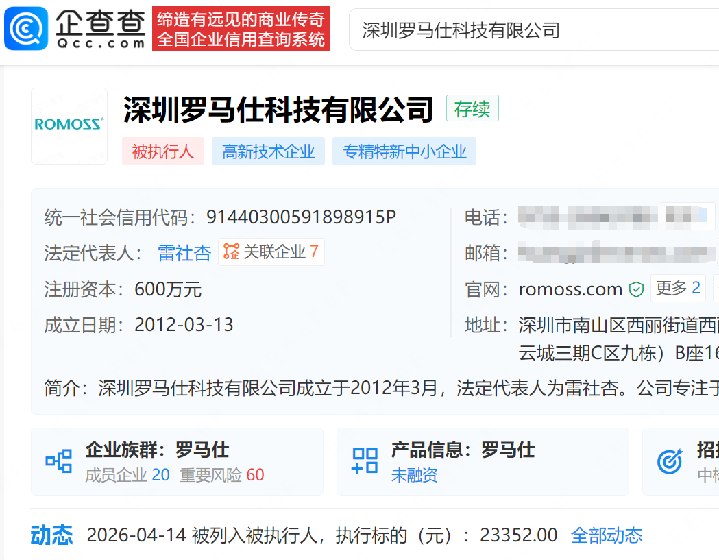 企查查APP显示,近日,深圳罗马仕科技有限公司新增16条被执行人信息,被执行总金额118.49万元,执行法院为广东省深圳市南山区人民法院。该公司成立于2012年3月,法定代表人雷社杏,注册资本600万元,经营范围包含电子产品的研发、设计、制造与销售、电子产品配件及原材料的销售等,由雷桂斌、雷灿伙共同持股。(企查查)