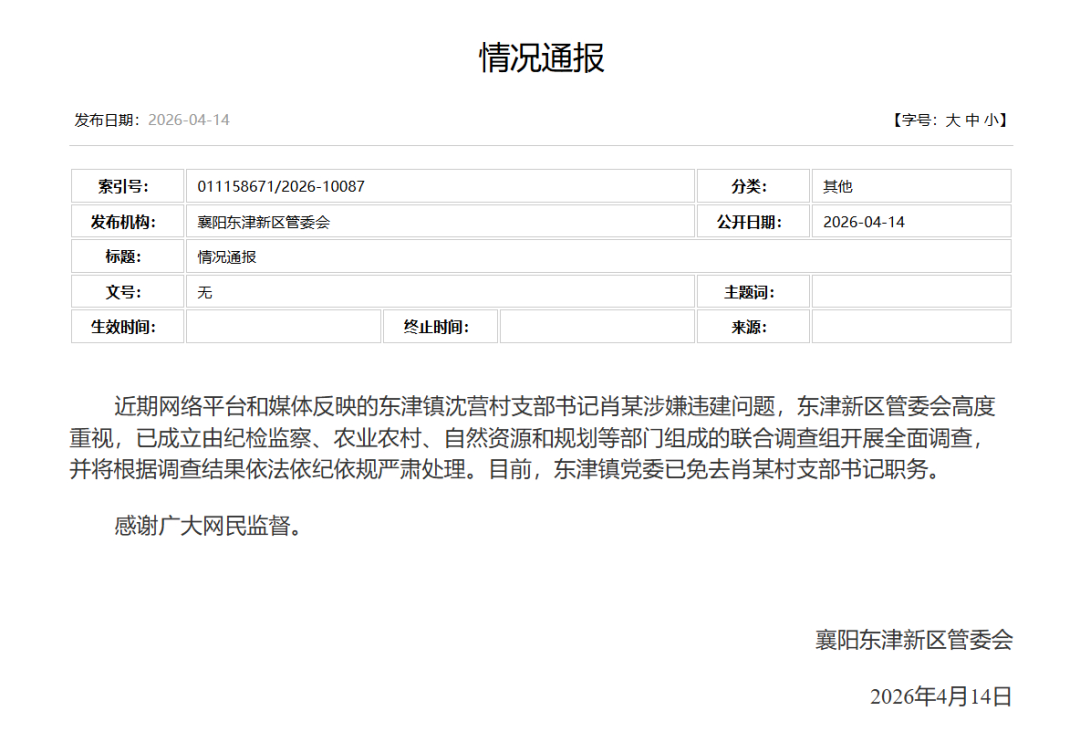襄阳东津新区管委会4月14日通报,近期网络平台和媒体反映的东津镇沈营村支部书记肖某涉嫌违建问题,东津新区管委会高度重视,已成立由纪检监察、农业农村、自然资源和规划等部门组成的联合调查组开展全面调查,并将根据调查结果依法依纪依规严肃处理。目前,东津镇党委已免去肖某村支部书记职务。