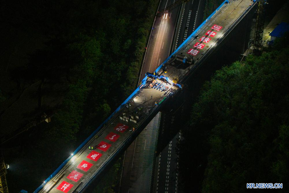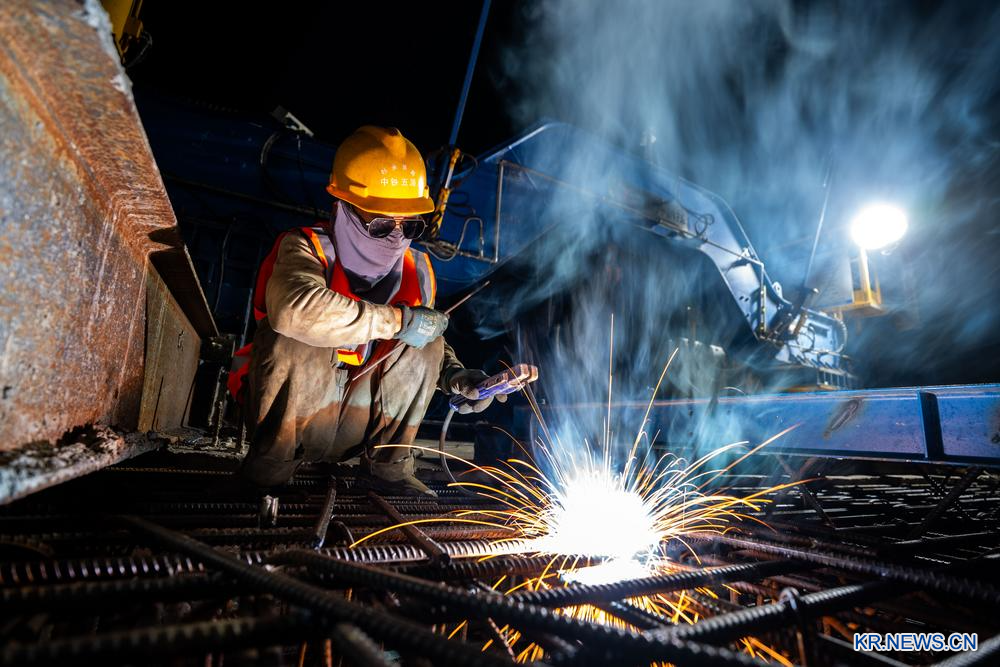 사오융(邵永·사오양~융저우) 고속철도 류자위안쯔(劉家院子)에서 얼롄하오터(二連浩特)~광저우(廣州) 고속도로를 가로지르는 특대교 건설 현장에서 중철(中鐵)5국 노동자들이 13일 새벽 교량 연결 공사를 진행하고 있다.