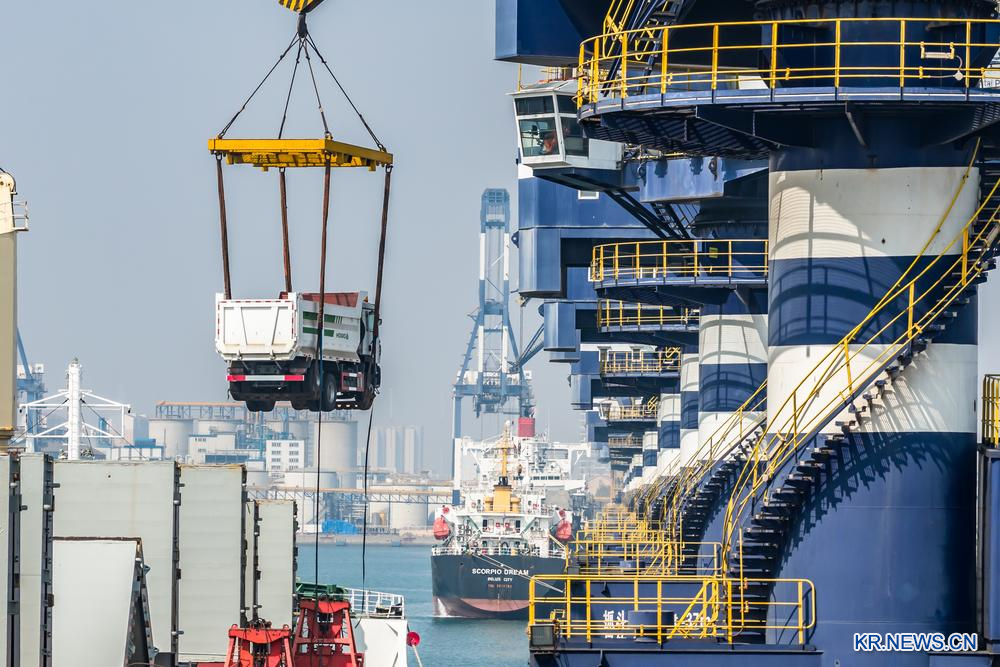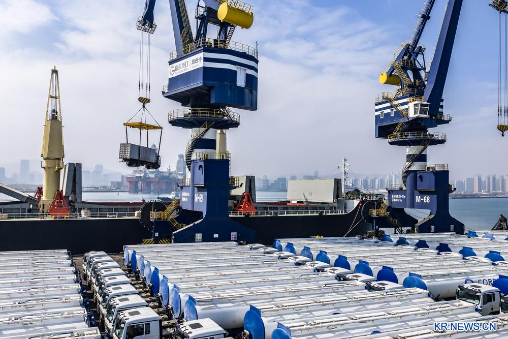 [신화망 중국 지난 4월 14일] 화물차, 유조차, 콘크리트 믹서차 등의 차량이 산둥(山東)항구 옌타이(煙臺)항에서 차례로 선적돼 아프리카로 수출될 준비를 하고 있다. 올 1분기 옌타이항 중국-아프리카 정기선의 잡화 발송량은 전년 동기 대비 31.9% 증가한 200만t(톤)을 돌파했다.