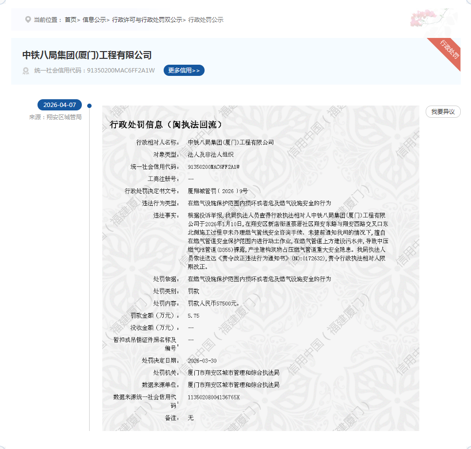 中铁八局集团(厦门)工程有限公司因这项原由被罚