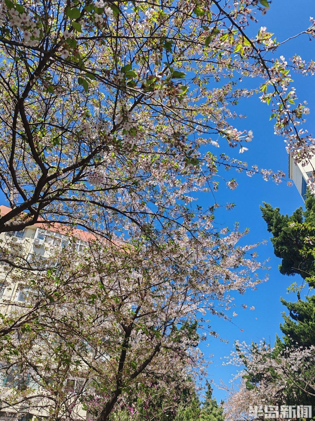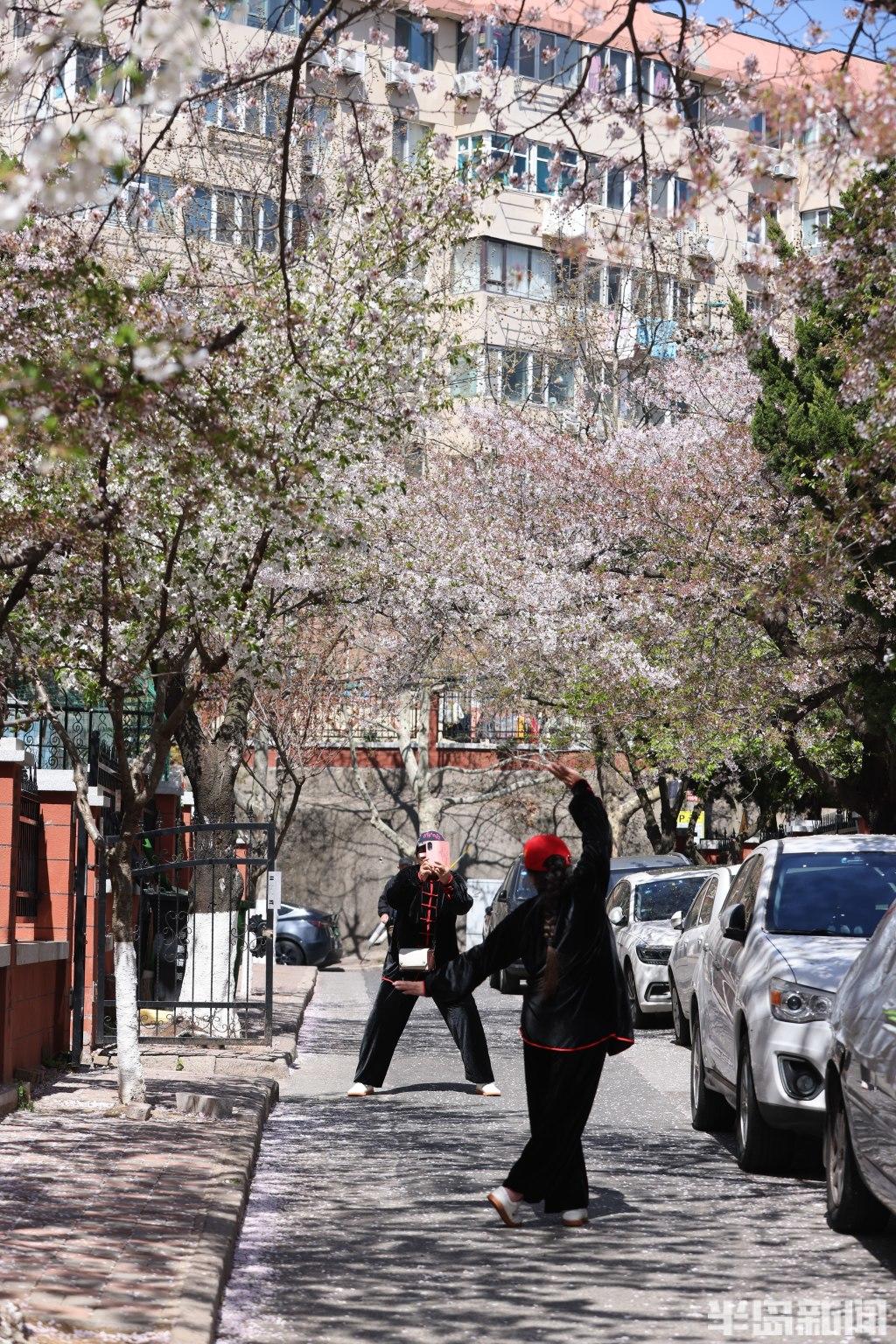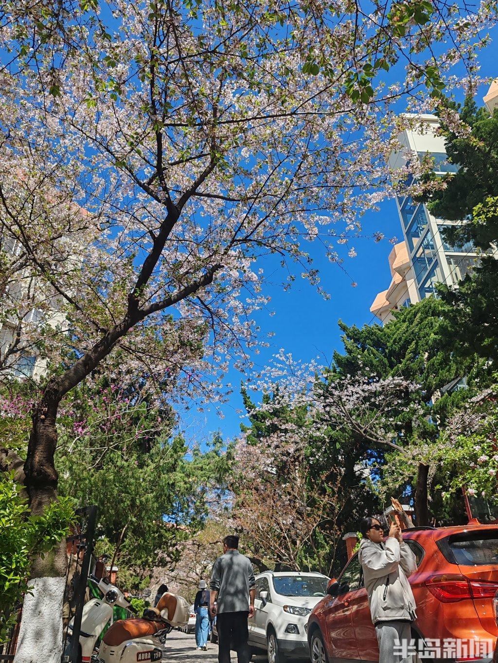 春风送暖,青岛市南区三明南路樱花如期绽放,这条藏于市井的赏樱胜地再度迎来游览高峰,随手取景皆是春日盛景。