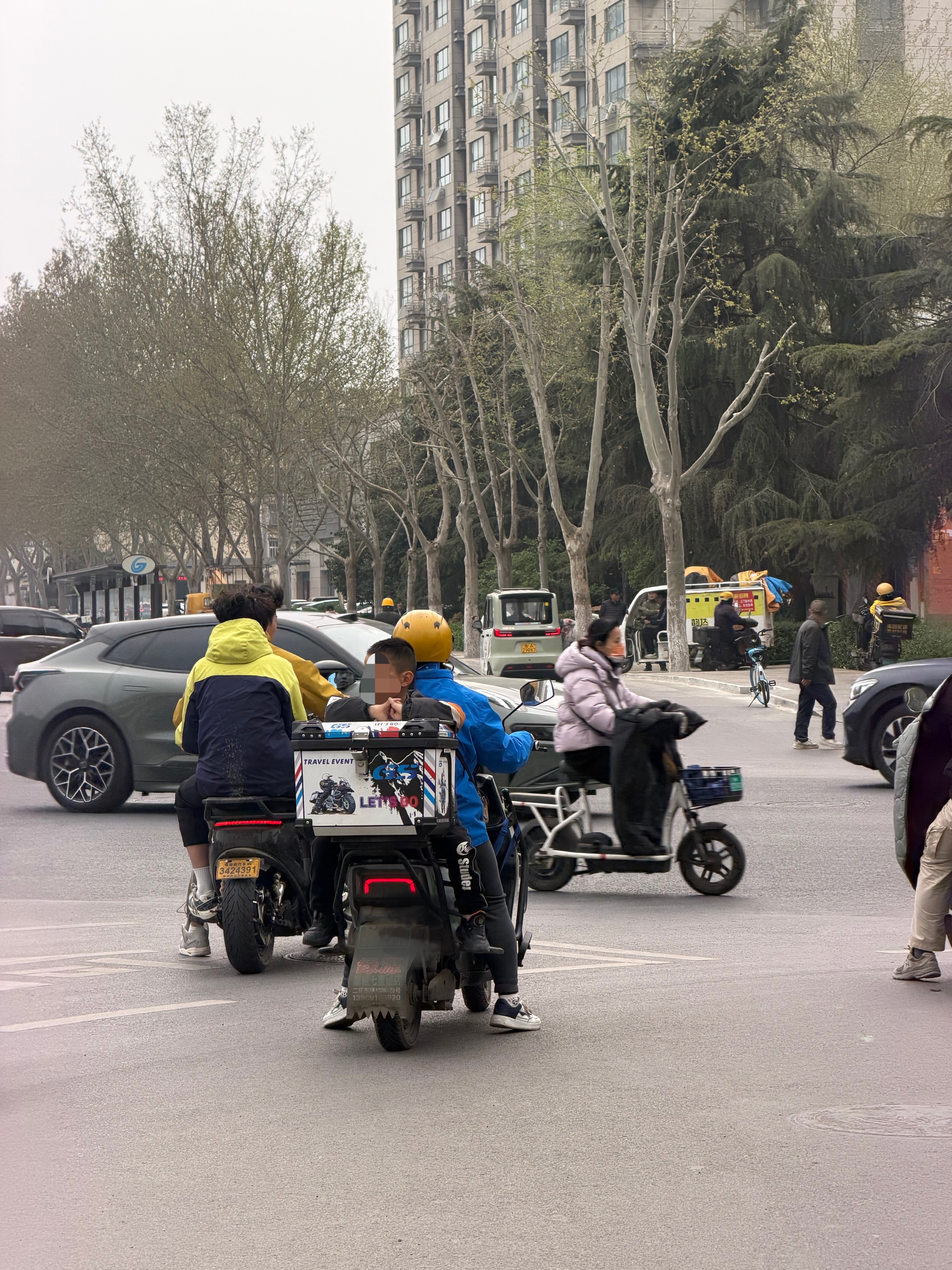 有些外卖员送餐时带着孩子,骑着电动车穿梭于街头巷尾